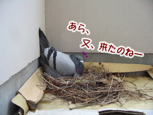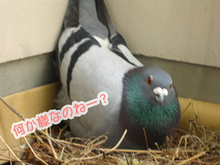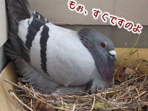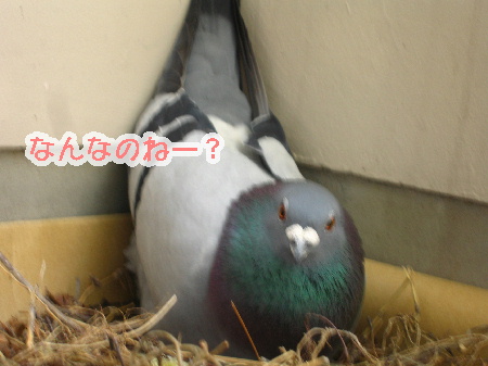 いつまでも眺めて居たかったけど、鳩ママ?パパ?さんが帰ってこれない、風邪でも引いたら大変!っと、退散・・・階段を下りて行く私を確認したのか、パタパタパタと鳩が雛の元へ帰ってる音が聞こえた!